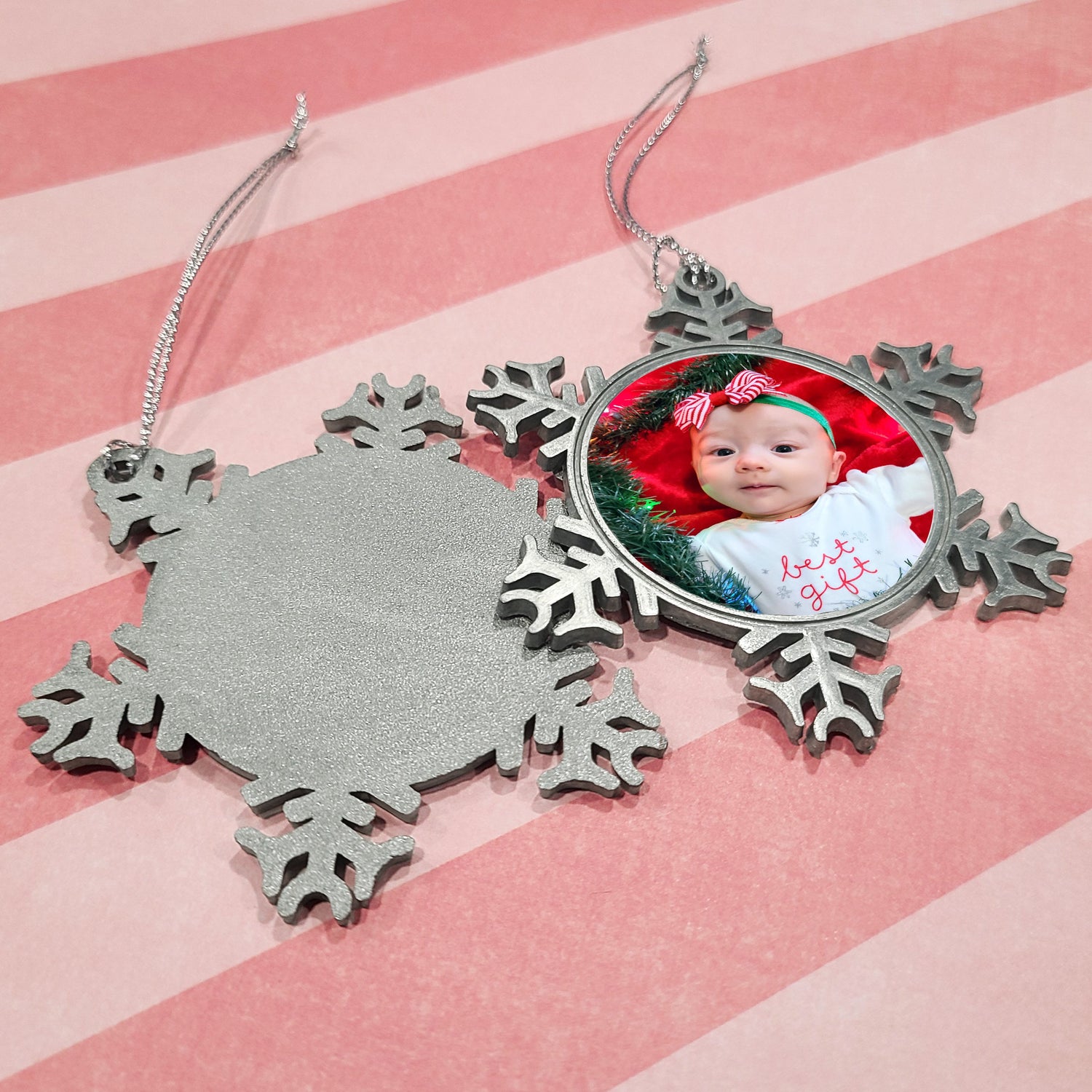 Custom-Photo Pewter Snowflake Ornament make a great gift for yourself or your friends and family. Add a fun family photo, family pet, baby's first Christmas, or a favorite car for that auto enthusiast so you can treasure and display your memories for years to come. These photo ornaments are made of Pewter with an elegant gloss white center to make your photo pop! Get creative and gift your memories to your loved ones. These ornaments are 3" around with an imprint area of 1.64" diamater & are .125" thick and come with a silver ribbon. Get creative, fully customizable and full print area of the front center area.